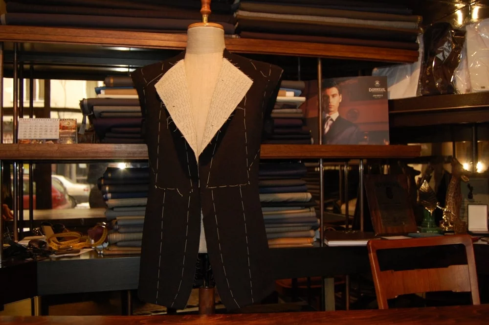 Skrojone poszczegolne części naszej kreacji polaczone fastrygom tworzą miarę, która po nałożeniu na klienta pozwala nam precyzyjnie zaznaczyć ostateczny kształt, proporcje i poszczególne detale wykonczenia.